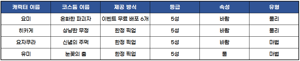 4명의 캐릭터 중 요미의 코스튬 총 6개 및 UR 전용장비까지 무료로 배포합니다.